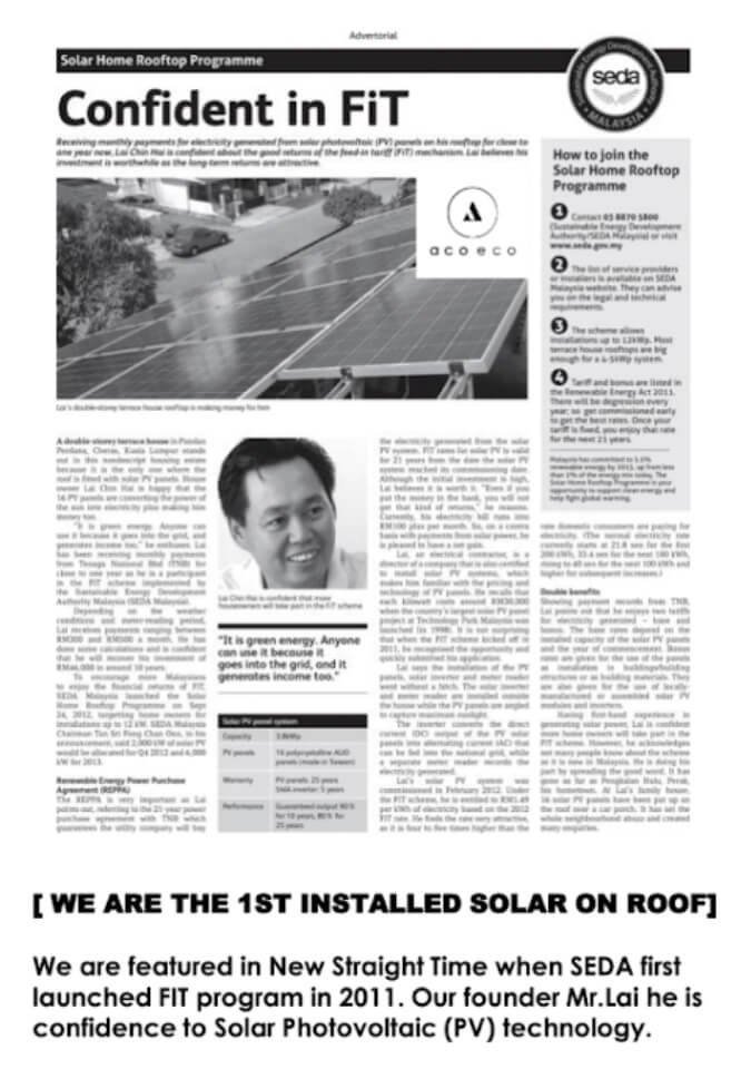 Founded in year 1995 as an electrical company. Renamed as Aco Eco in year 2013 where we focused in promote and create awareness of solar the renewable energy to the public. We are Eco Futurist that love seeking ways to conserve our mother earth relentlessly using Eco Building Materials, Solar Power and Mechanical & Engineering.